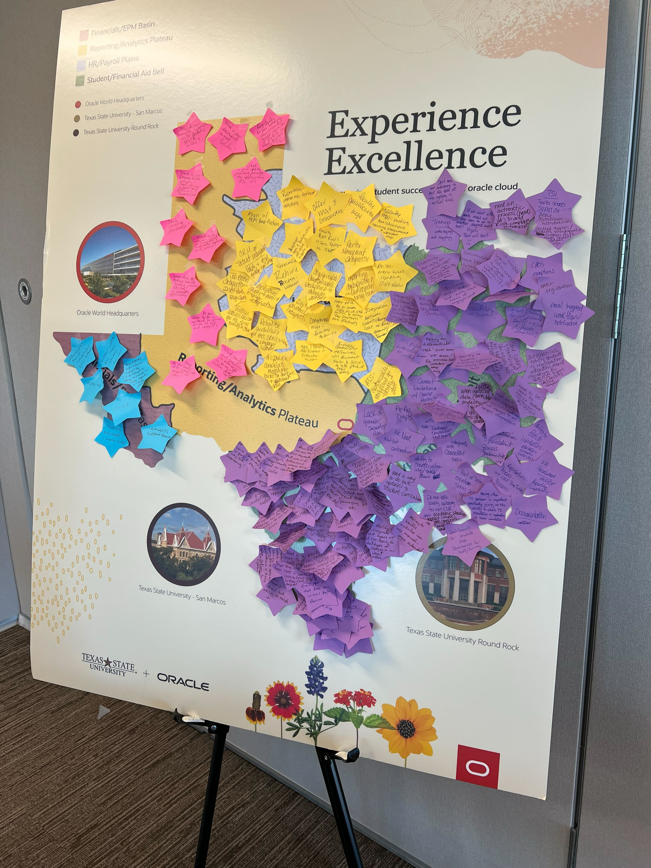 This large scale standing poster was used for feedback at an in-person meeting at the Oracle Office. The meeting was focused on four industry areas, which I conveniently shaped into the state of Texas for their familiarity. Participants were asked to add feedback to their industry area on the map. This meeting also included banners, place mats, name tags, and digital demo experiences.